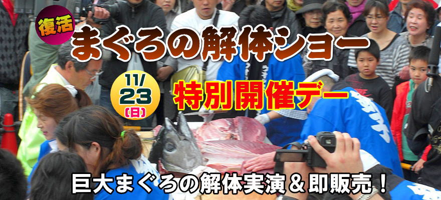 復活!11月23日まぐろの解体ショー![]() 大人気だった!まぐろ解体ショーが帰ってきました!銚子港で水揚げされた巨大鮪を目の前で鮮やかに解体!解体した「まぐろ」は実演販売します! ぜひ!クーラーボックスご持参がよろしいですよ!たった2日限りです!